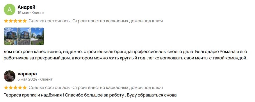 Я остался очень доволен сотрудничеством с вашей компанией. Строительство дома из бруса прошло быстро и качественно. Специалисты проявили высокий профессионализм и внимательность к деталям. Дом получился уютным и тёплым, идеально вписался в ландшафт участка. Обязательно порекомендую вас своим друзьям и знакомым.