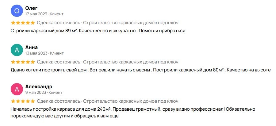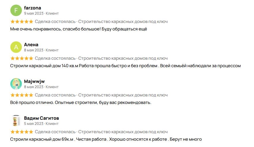 Я очень благодарна компании за строительство дома из бруса. Все этапы прошли без проблем, специалисты работали быстро и аккуратно. Дом получился красивый и тёплый, идеально вписался в наш участок. Я осталась полностью довольна результатом и рекомендую вашу компанию другим клиентам.
